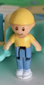 Nom : Wee Willie Genre : masculin Type de cheveux : – Couleur de cheveux : – Longueur : courts Coiffure : – Vêtements : t-shirt jaune, pantalon bleu clair Chaussures : blanches Base : blanche Accessoire(s) : casquette jaune Numéro : 3 |